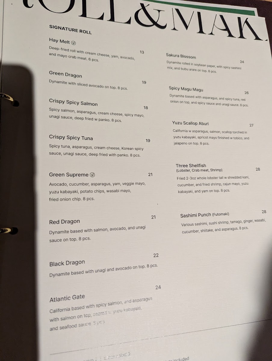- Sushi Rolls: Includes a range of classic and signature rolls such as the Red Dragon Dynamite roll with salmon and avocado, the Sakura Blossom roll featuring spicy sashimi mix, and vegetarian options like Shiitake Mushroom & Cucumber Maki. Portions typically come in six or eight pieces.