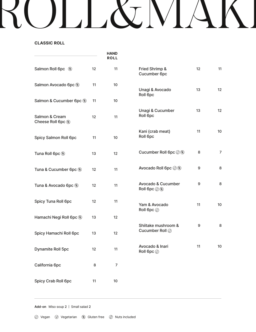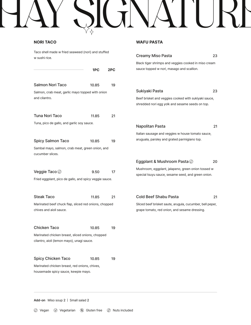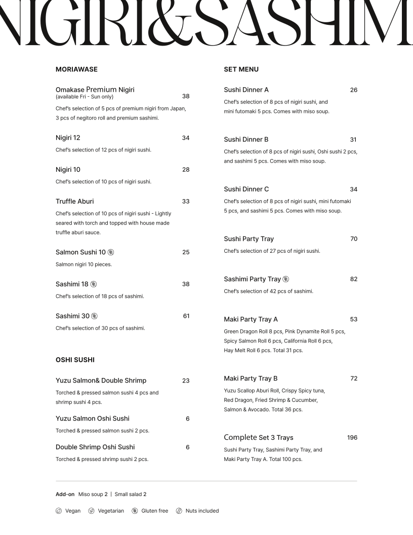 The menu caters to various dining needs, from quick takeaway orders to more leisurely casual meals. It provides choices suitable for lunch, dinner, as well as light meals or sharing plates. The combination of sushi, fusion pasta dishes, and small plates makes the menu versatile for different preferences and group sizes.